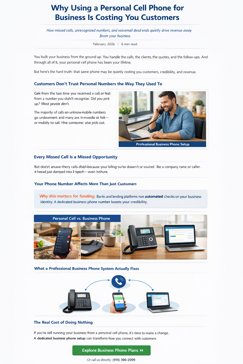 If you are still running your business from a personal cell phone, now is a good time to see what a change looks like. A dedicated business phone setup does not have to be complicated or expensive. It just has to work — and represent your business the way it deserves.